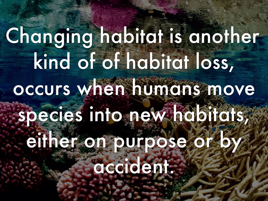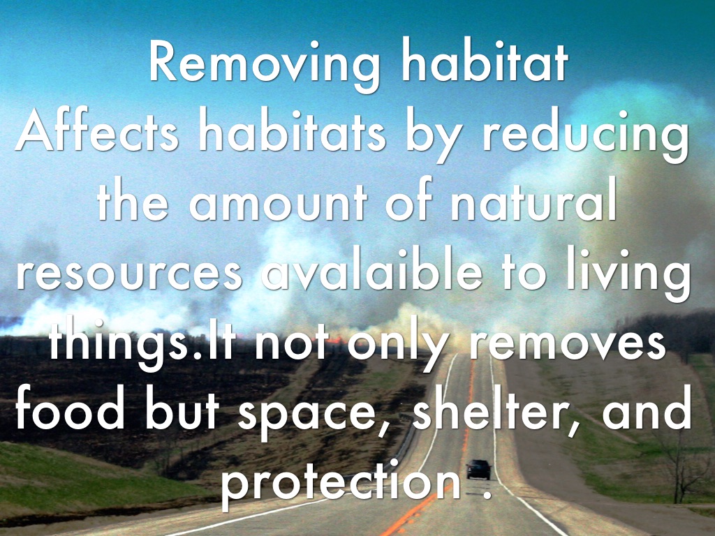Removing habitat Affects habitats by reducing the amount of natural resources avalaible to living things.It not only removes food but space, shelter, and protection .