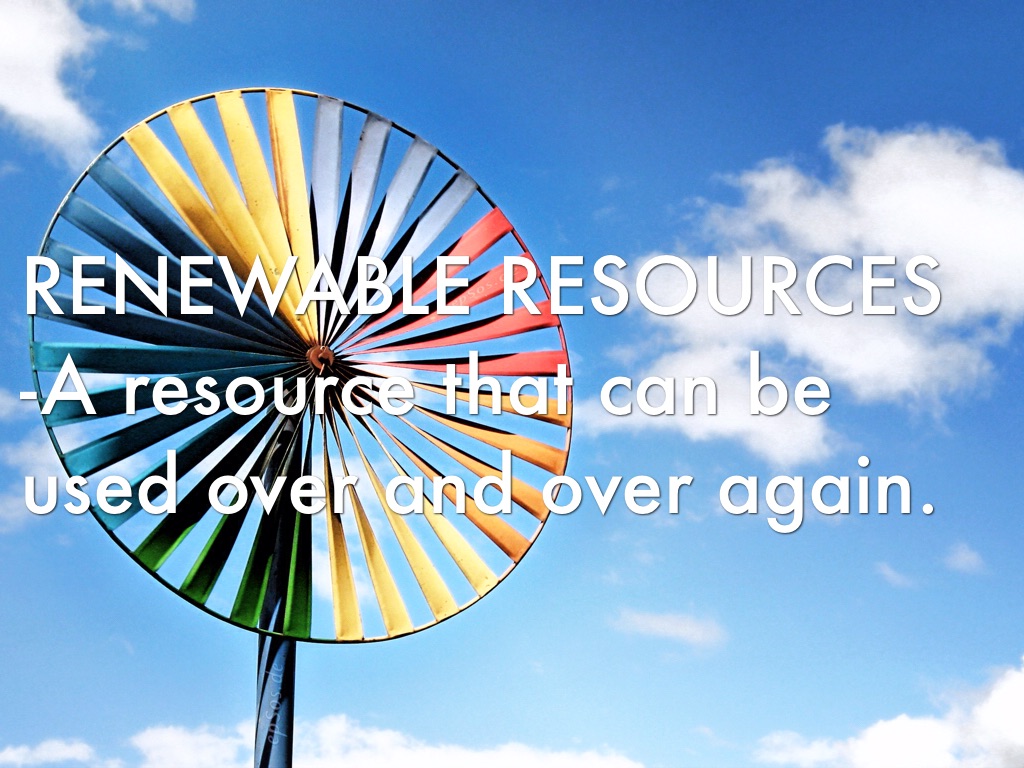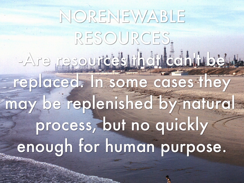 NORENEWABLE RESOURCES -Are resources that can't be replaced. In some cases they may be replenished by natural process, but no quickly enough for human purpose.