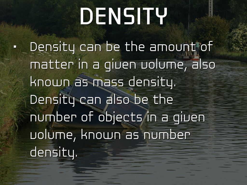 Density can be the amount of matter in a given volume, also known as mass density. Density can also be the number of objects in a given volume, known as number density.