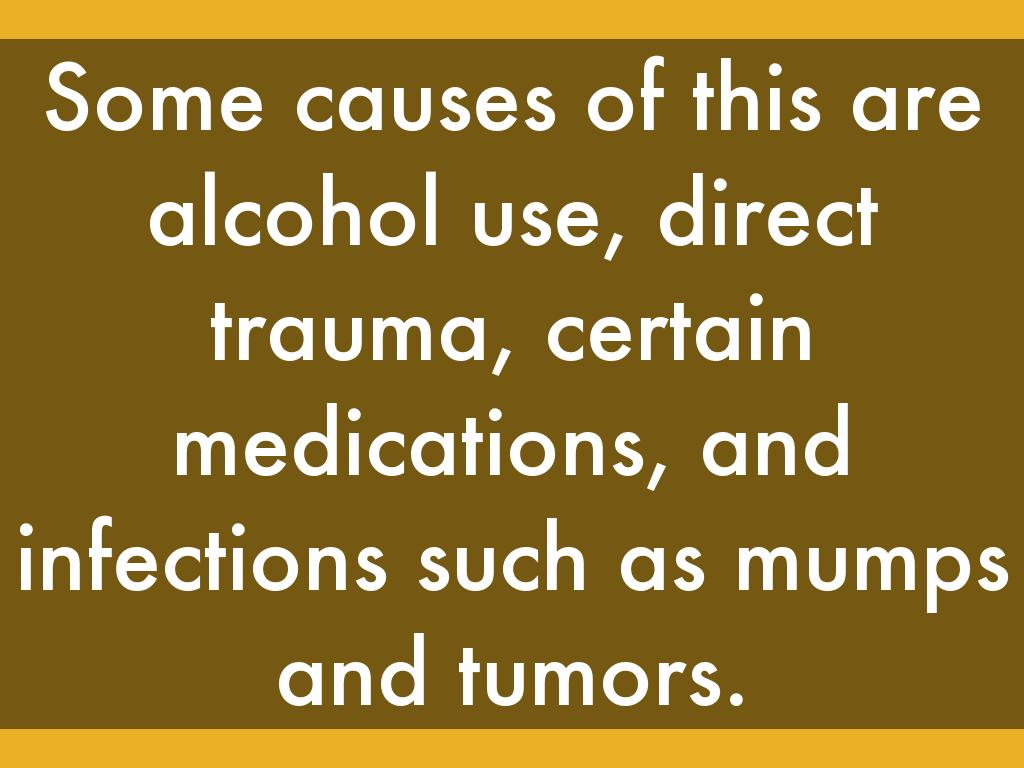 Some causes of this are alcohol use, direct trauma, certain medications, and infections such as mumps and tumors.