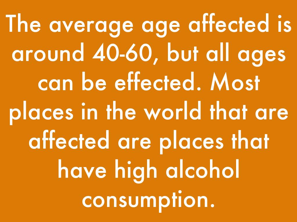 The average age affected is around 40-60, but all ages can be effected. Most places in the world that are affected are places that have high alcohol consumption.