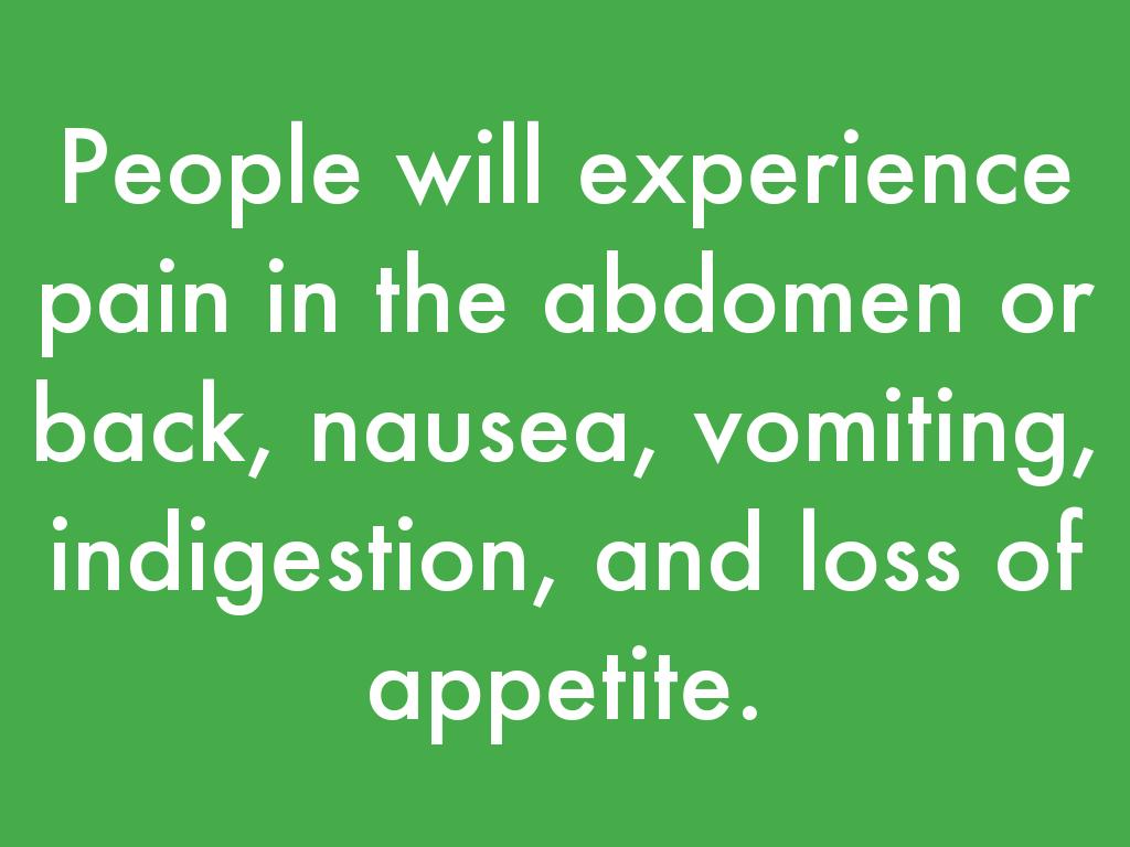 People will experience pain in the abdomen or back, nausea, vomiting, indigestion, and loss of appetite.