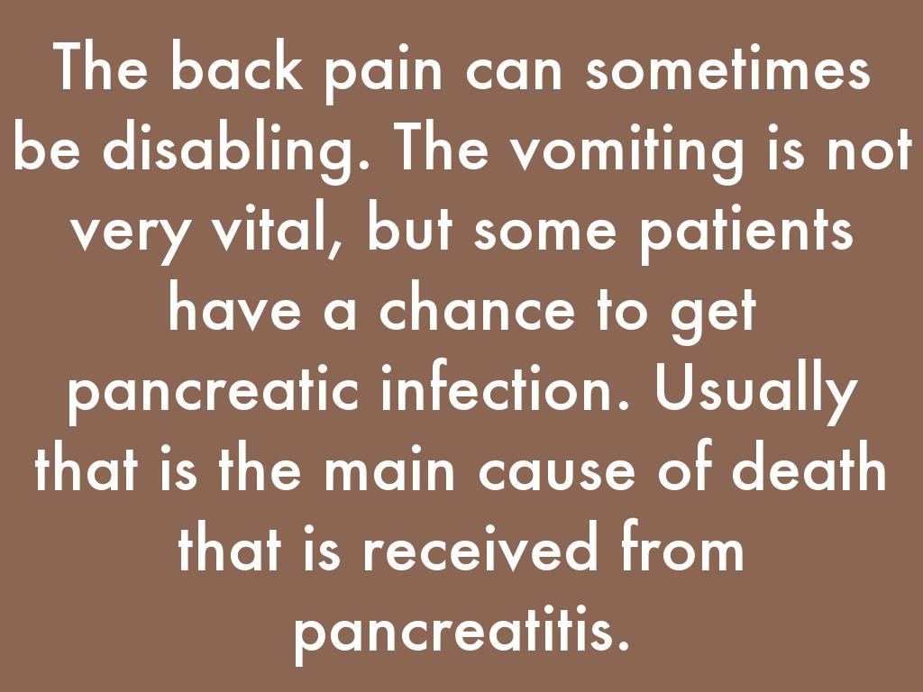 The back pain can sometimes be disabling. The vomiting is not very vital, but some patients have a chance to get pancreatic infection. Usually that is the main cause of death that is received from pancreatitis.