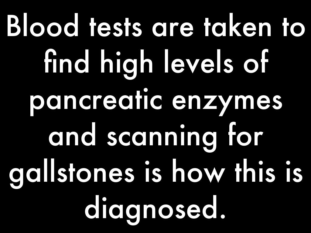 Blood tests are taken to find high levels of pancreatic enzymes and scanning for gallstones is how this is diagnosed.