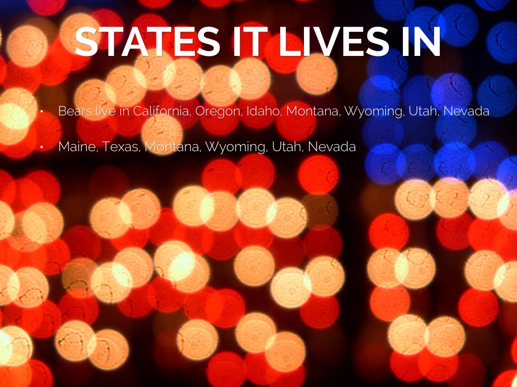 Bears live in California, Oregon, Idaho, Montana, Wyoming, Utah, Nevada