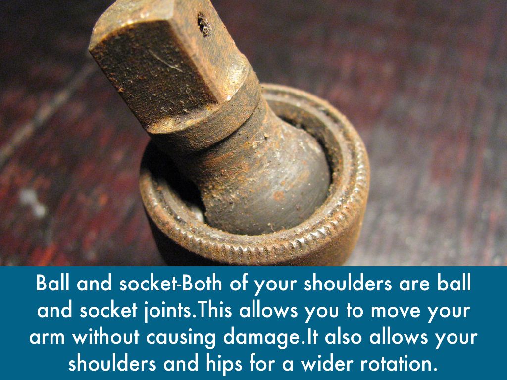 Ball and socket-Both of your shoulders are ball and socket joints.This allows you to move your arm without causing damage.It also allows your shoulders and hips for a wider rotation.