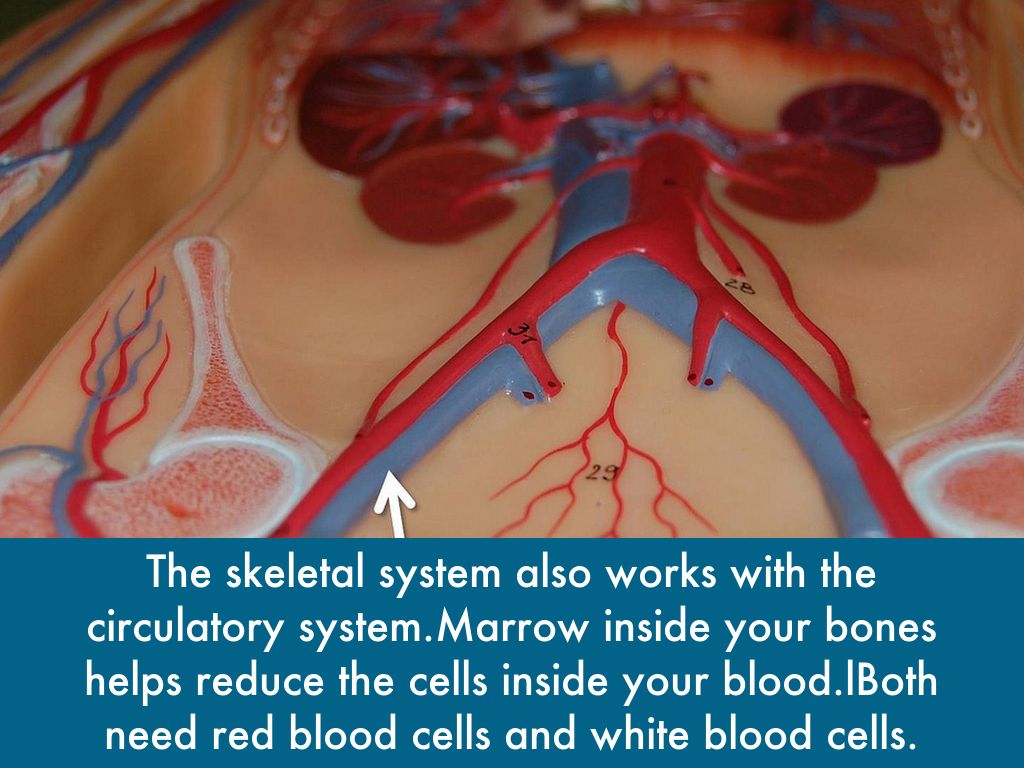 The skeletal system also works with the circulatory system.Marrow inside your bones helps reduce the cells inside your blood.lBoth need red blood cells and white blood cells.