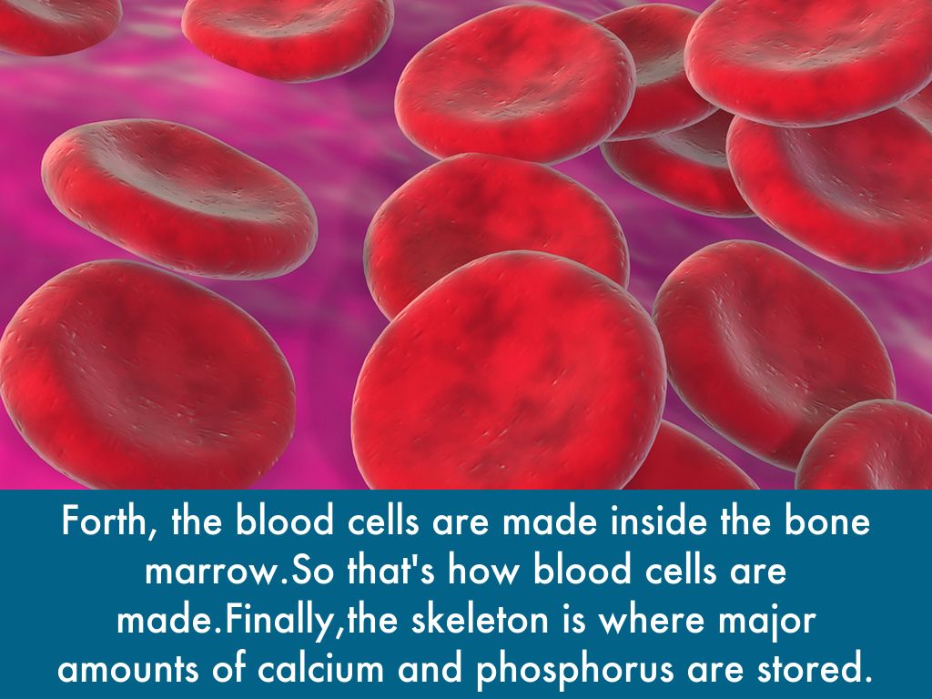 Forth, the blood cells are made inside the bone marrow.So that's how blood cells are made.Finally,the skeleton is where major amounts of calcium and phosphorus are stored.