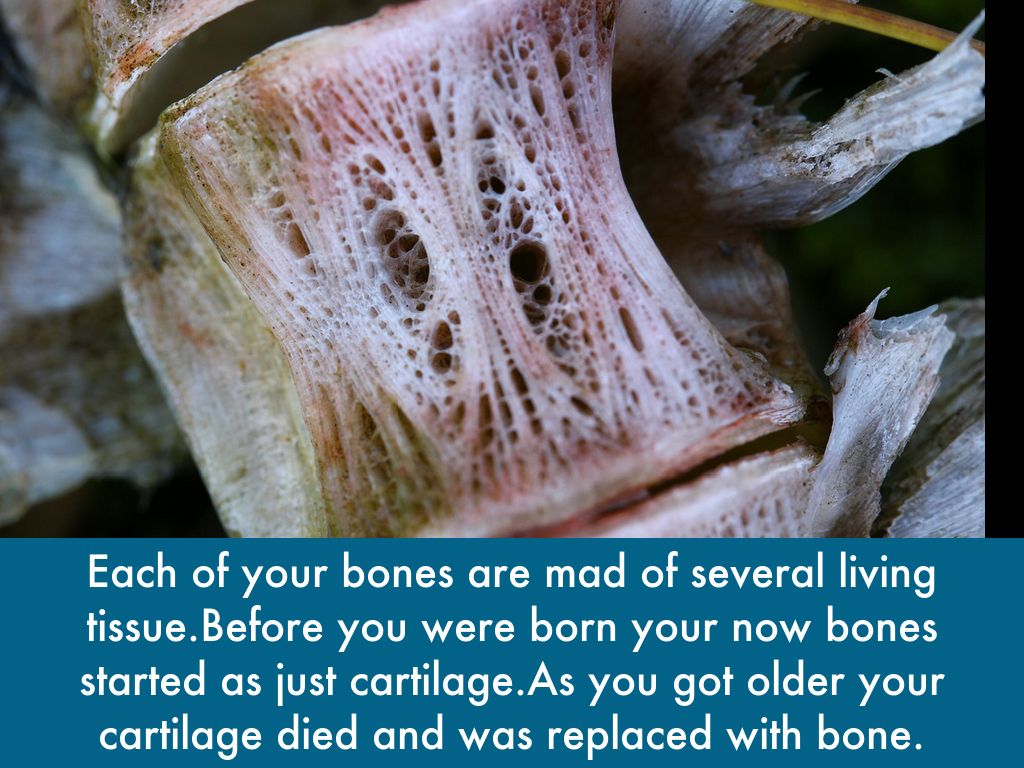 Each of your bones are mad of several living tissue.Before you were born your now bones started as just cartilage.As you got older your cartilage died and was replaced with bone.