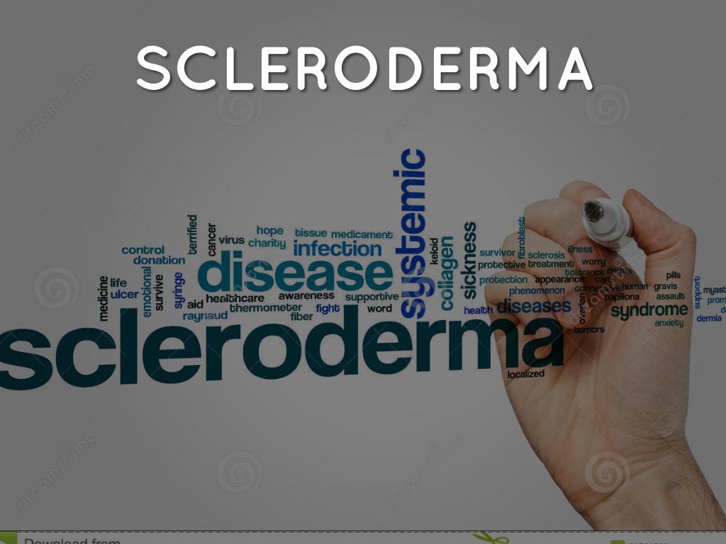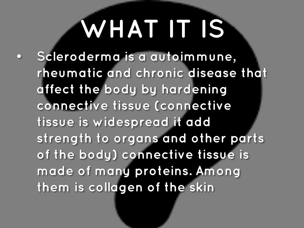 Scleroderma is a autoimmune, rheumatic and chronic disease that affect the body by hardening connective tissue (connective tissue is widespread it add strength to organs and other parts of the body) connective tissue is made of many proteins. Among them is collagen of the skin