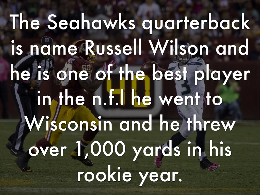 The Seahawks quarterback is name Russell Wilson and he is one of the best player in the n.f.l he went to Wisconsin and he threw over 1,000 yards in his rookie year.