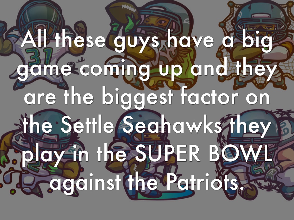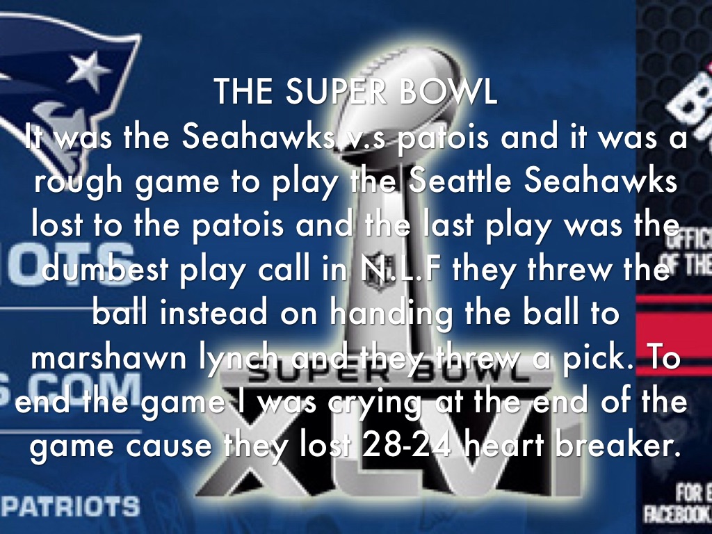 THE SUPER BOWL It was the Seahawks v.s patois and it was a rough game to play the Seattle Seahawks lost to the patois and the last play was the dumbest play call in N.L.F they threw the ball instead on handing the ball to marshawn lynch and they threw a pick. To end the game I was crying at the end of the game cause they lost 28-24 heart breaker.