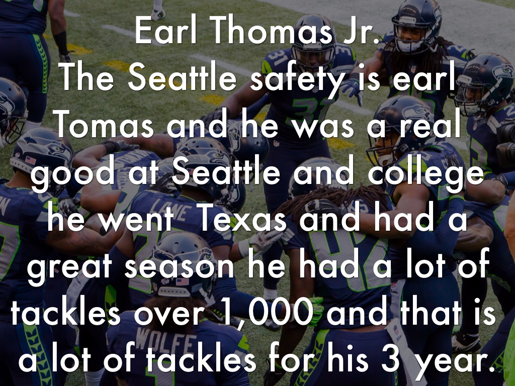 Earl Thomas Jr. The Seattle safety is earl Tomas and he was a real good at Seattle and college he went Texas and had a great season he had a lot of tackles over 1,000 and that is a lot of tackles for his 3 year.