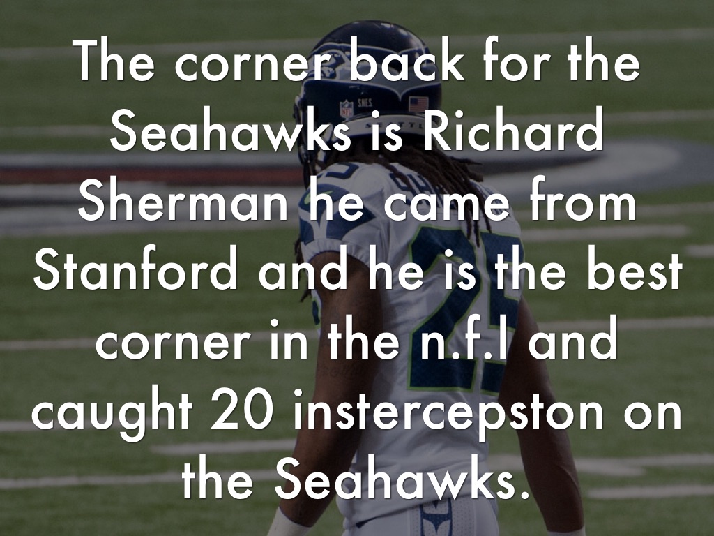The corner back for the Seahawks is Richard Sherman he came from Stanford and he is the best corner in the n.f.l and caught 20 instercepston on the Seahawks.