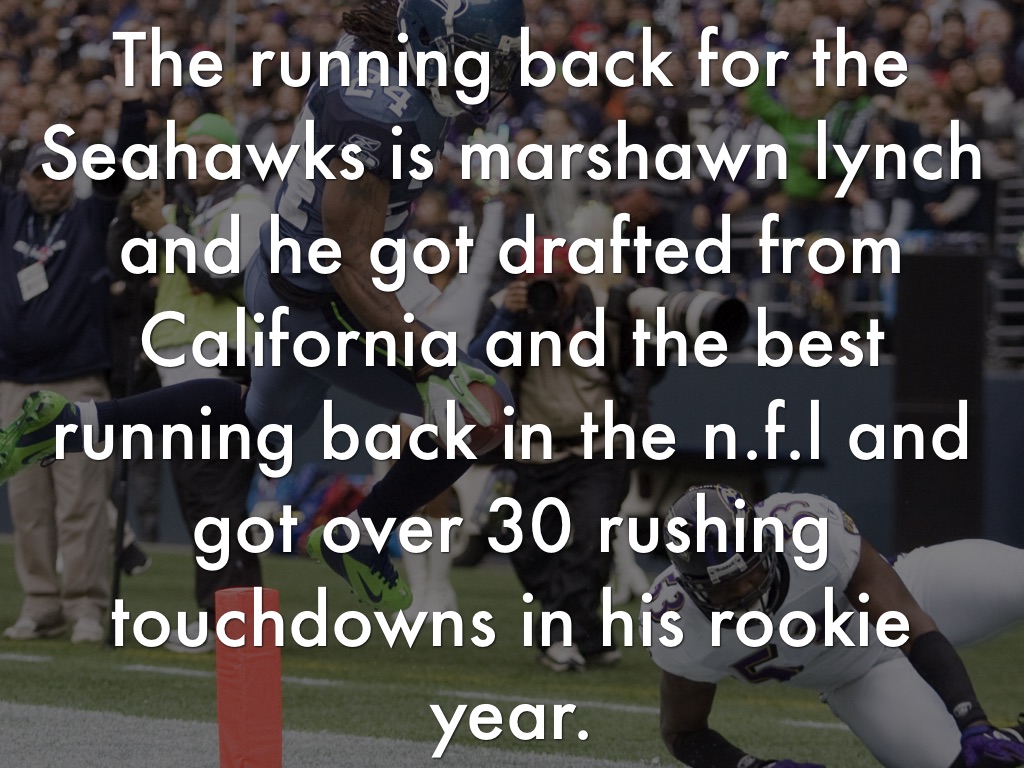 The running back for the Seahawks is marshawn lynch and he got drafted from California and the best running back in the n.f.l and got over 30 rushing touchdowns in his rookie year.
