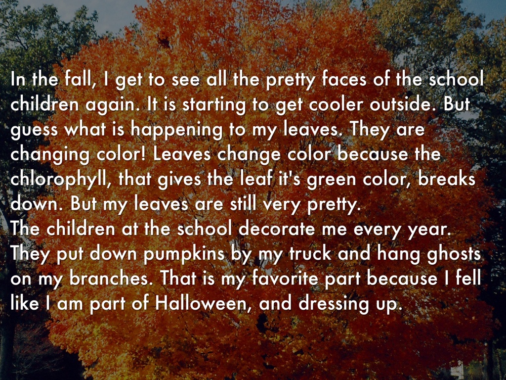 In the fall, I get to see all the pretty faces of the school children again. It is starting to get cooler outside. But guess what is happening to my leaves. They are changing color! Leaves change color because the chlorophyll, that gives the leaf it's green color, breaks down. But my leaves are still very pretty. The children at the school decorate me every year. They put down pumpkins by my truck and hang ghosts on my branches. That is my favorite part because I fell like I am part of Halloween, and dressing up.
