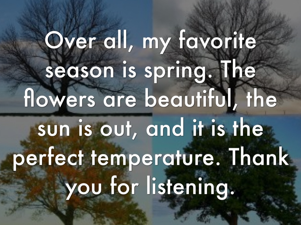 It is spring time now, my favorite. Because the flowers are starting to come back and the SNOW IS GONE! I have been waiting all winter for this moment and it's finally come. HORRAY! My favorite part of spring is when my leaves come back. When they do, it is near the end of spring and more into summer. But oh well. It can be very cold in the spring, especially in Northern Michigan. The days are starting to get longer, and the nights shorter. Every morning I am woken up by school children. I feel a big tug on one of my branches. So I look and spot children hanging on me, in shorts and t-shirts, with the sun shining. So happy to see that because we hard a really bad, and cold winter. Spring is caused by the earths tilt, not by how far away you are from the sun. During the night, I see my favorite constellation, Great Bear. Which only occurs during the spring time.