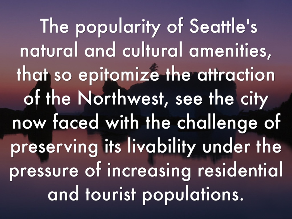The popularity of Seattle's natural and cultural amenities, that so epitomize the attraction of the Northwest, see the city now faced with the challenge of preserving its livability under the pressure of increasing residential and tourist populations.