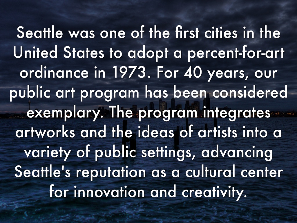 Seattle was one of the first cities in the United States to adopt a percent-for-art ordinance in 1973. For 40 years, our public art program has been considered exemplary. The program integrates artworks and the ideas of artists into a variety of public settings, advancing Seattle's reputation as a cultural center for innovation and creativity.