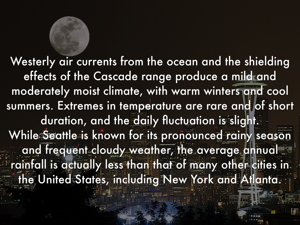 Westerly air currents from the ocean and the shielding effects of the Cascade range produce a mild and moderately moist climate, with warm winters and cool summers. Extremes in temperature are rare and of short duration, and the daily fluctuation is slight. While Seattle is known for its pronounced rainy season and frequent cloudy weather, the average annual rainfall is actually less than that of many other cities in the United States, including New York and Atlanta.