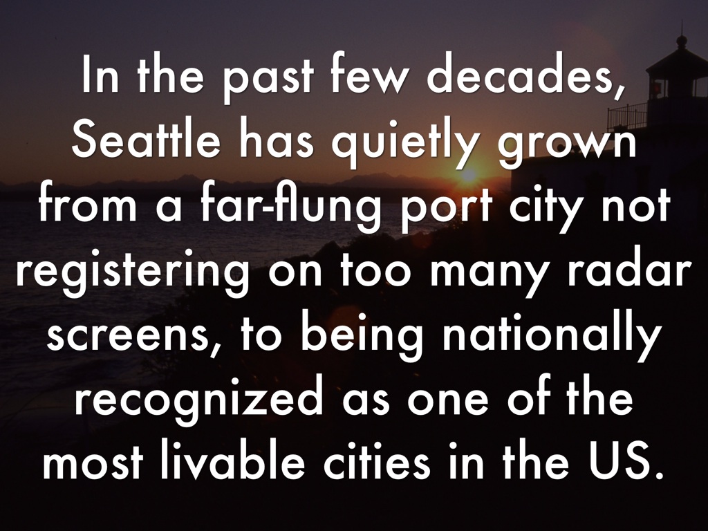 In the past few decades, Seattle has quietly grown from a far-flung port city not registering on too many radar screens, to being nationally recognized as one of the most livable cities in the US.