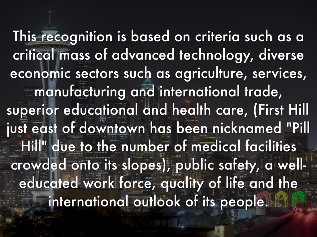 This recognition is based on criteria such as a critical mass of advanced technology, diverse economic sectors such as agriculture, services, manufacturing and international trade, superior educational and health care, (First Hill just east of downtown has been nicknamed "Pill Hill" due to the number of medical facilities crowded onto its slopes), public safety, a well-educated work force, quality of life and the international outlook of its people.