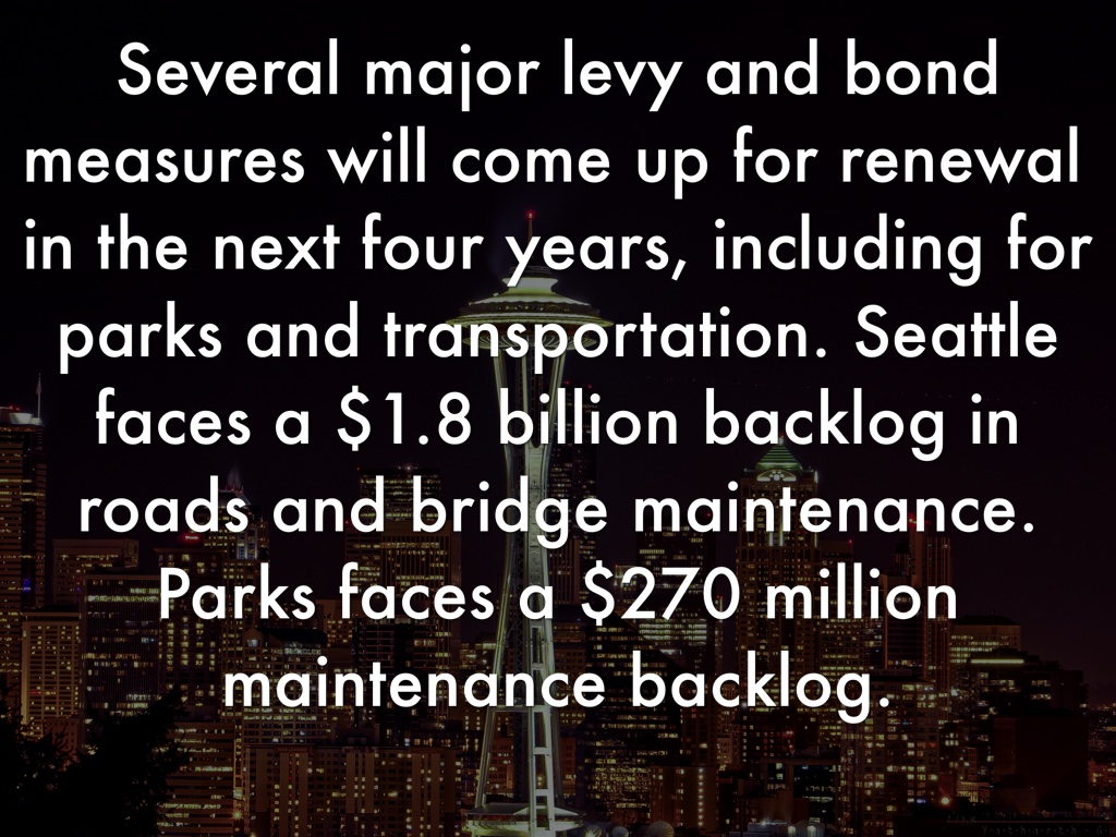 Several major levy and bond measures will come up for renewal in the next four years, including for parks and transportation. Seattle faces a $1.8 billion backlog in roads and bridge maintenance. Parks faces a $270 million maintenance backlog.