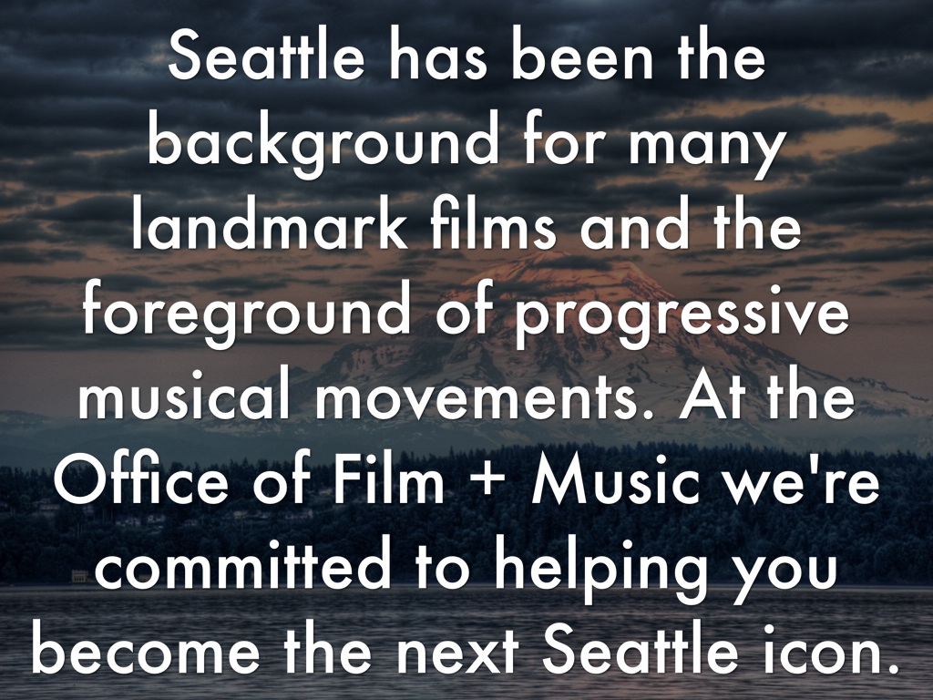 Seattle has been the background for many landmark films and the foreground of progressive musical movements. At the Office of Film + Music we're committed to helping you become the next Seattle icon.