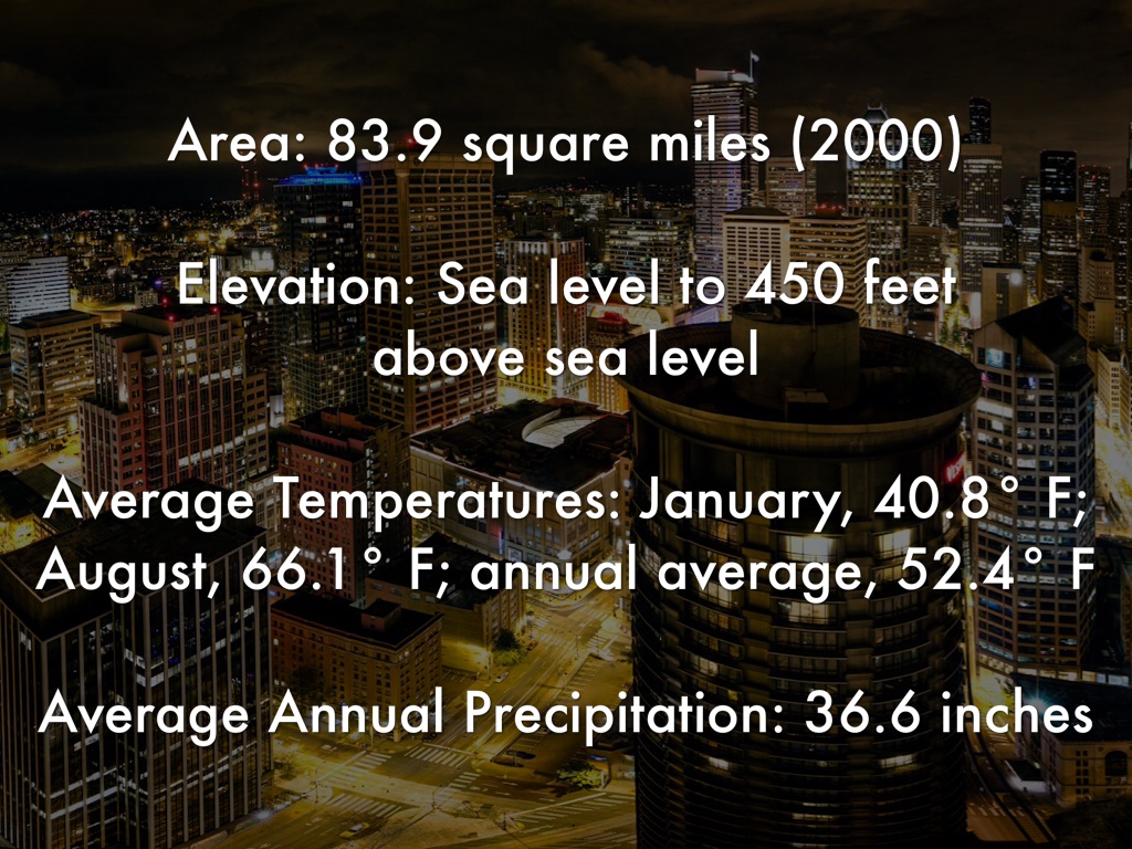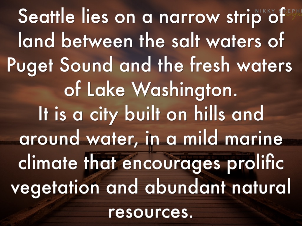 Seattle lies on a narrow strip of land between the salt waters of Puget Sound and the fresh waters of Lake Washington. It is a city built on hills and around water, in a mild marine climate that encourages prolific vegetation and abundant natural resources.