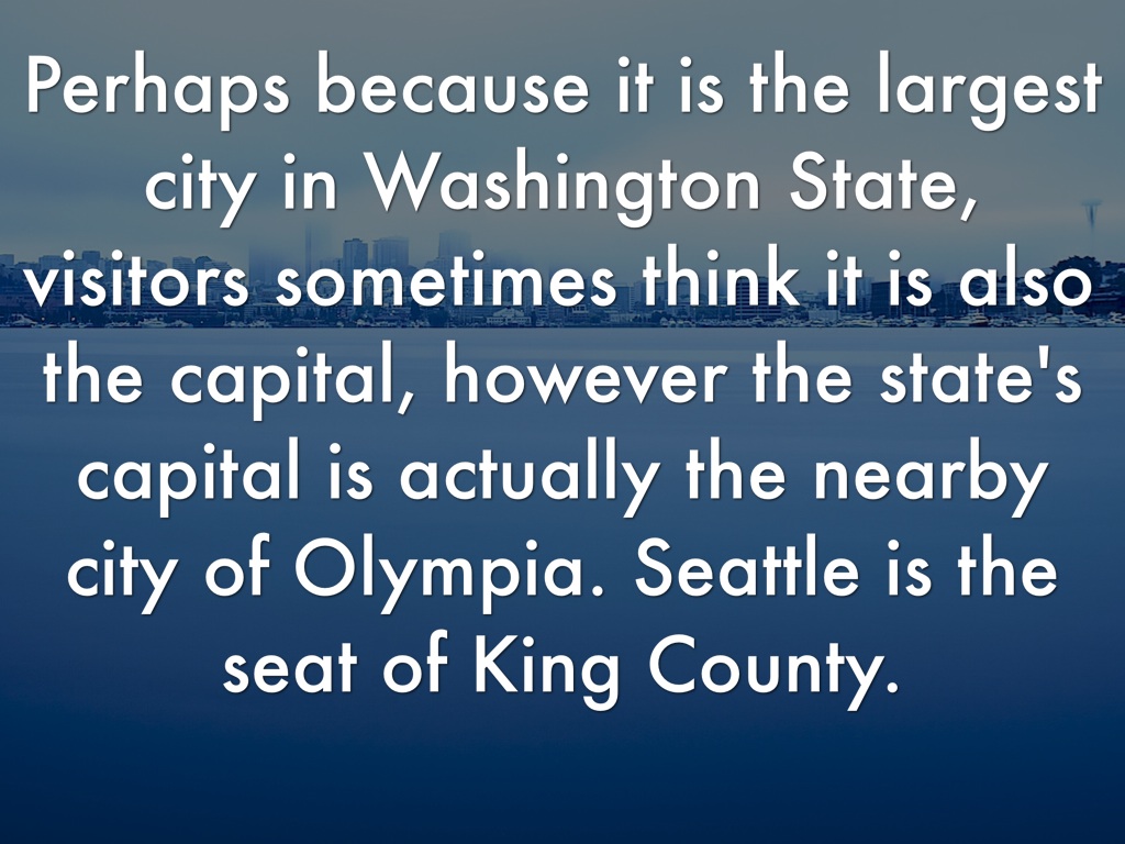 Perhaps because it is the largest city in Washington State, visitors sometimes think it is also the capital, however the state's capital is actually the nearby city of Olympia. Seattle is the seat of King County.