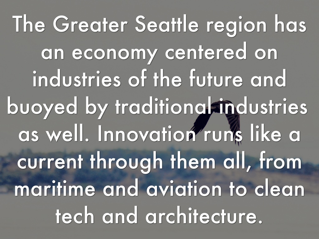 The Greater Seattle region has an economy centered on industries of the future and buoyed by traditional industries as well. Innovation runs like a current through them all, from maritime and aviation to clean tech and architecture.