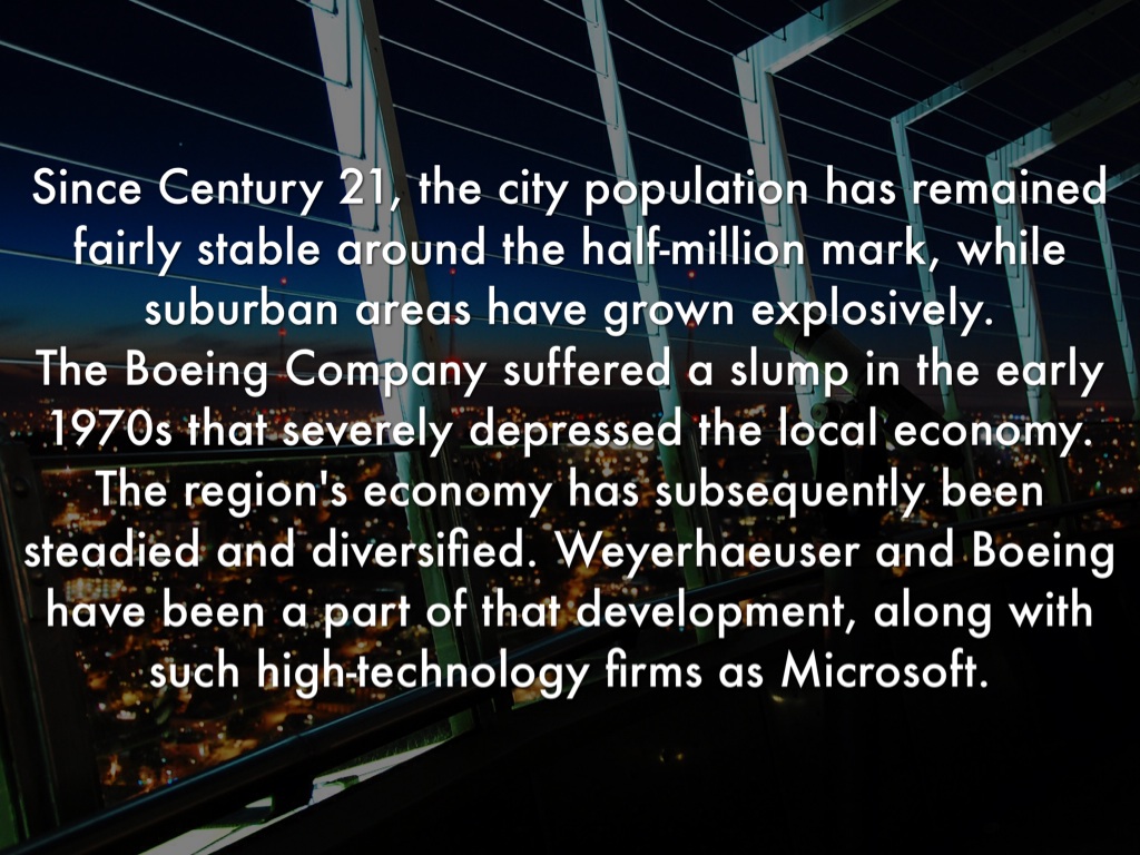 Since Century 21, the city population has remained fairly stable around the half-million mark, while suburban areas have grown explosively. The Boeing Company suffered a slump in the early 1970s that severely depressed the local economy. The region's economy has subsequently been steadied and diversified. Weyerhaeuser and Boeing have been a part of that development, along with such high-technology firms as Microsoft.