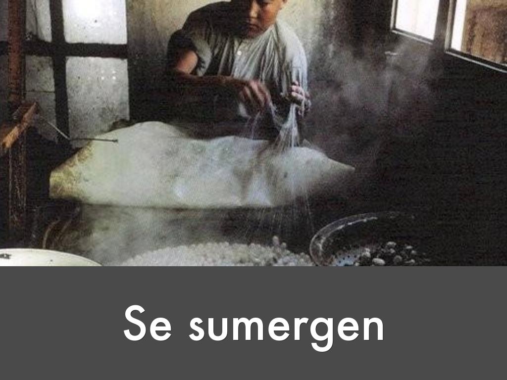 Los capullos se sumergen en agua caliente que ablanda la ceresina y suelta los filamentos.