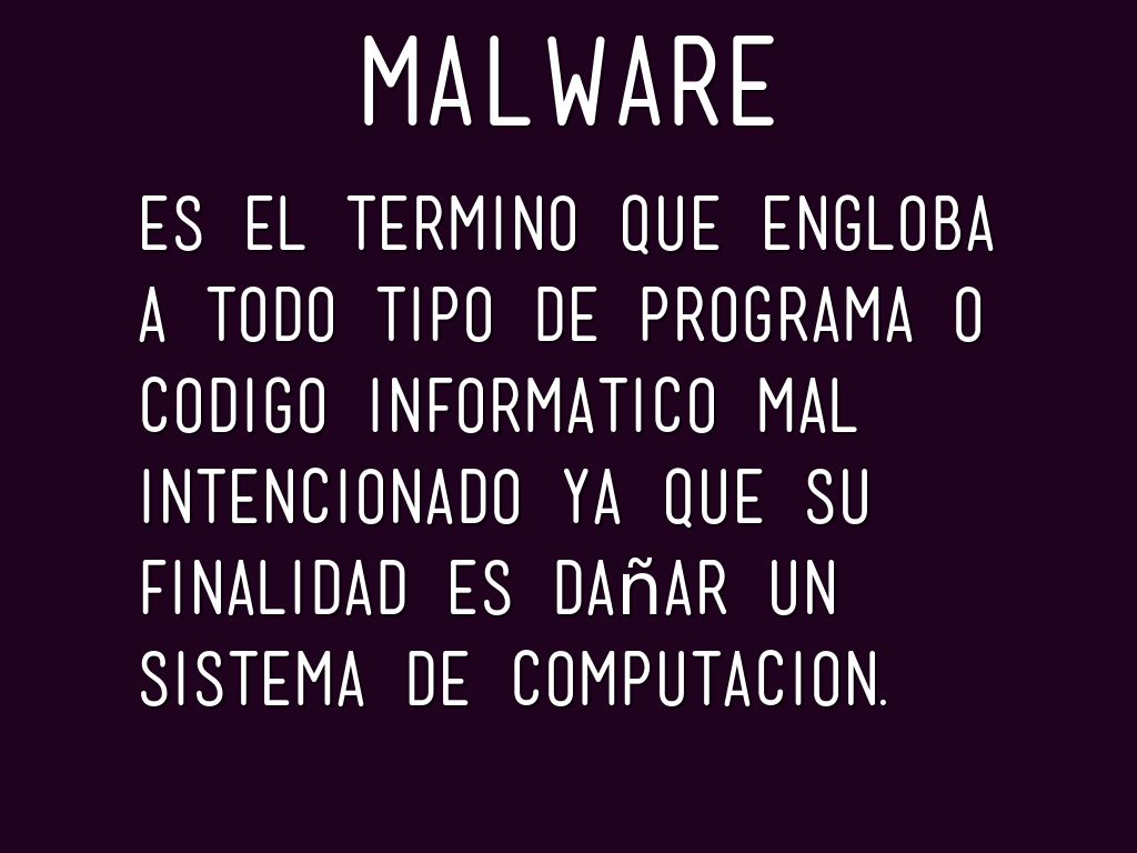 Es el termino que engloba a todo tipo de programa o codigo informatico mal intencionado ya que su finalidad es dañar un sistema de computacion.