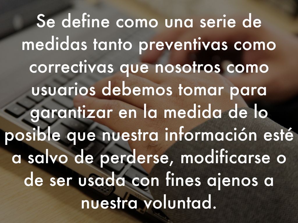 Se define como una serie de medidas tanto preventivas como correctivas que nosotros como usuarios debemos tomar para garantizar en la medida de lo posible que nuestra información esté a salvo de perderse, modificarse o de ser usada con fines ajenos a nuestra voluntad.