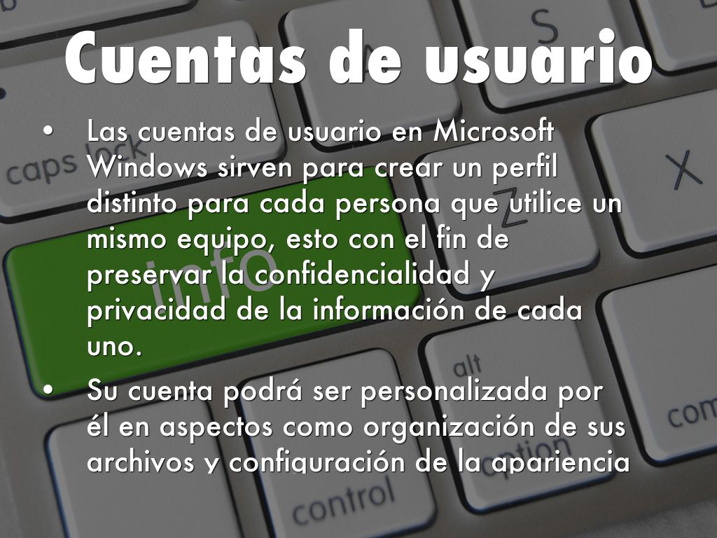 Las cuentas de usuario en Microsoft Windows sirven para crear un perfil distinto para cada persona que utilice un mismo equipo, esto con el fin de preservar la confidencialidad y privacidad de la información de cada uno.
