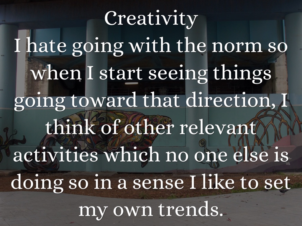 Creativity I hate going with the norm so when I start seeing things going toward that direction, I think of other relevant activities which no one else is doing so in a sense I like to set my own trends.