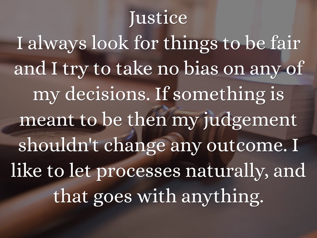 Justice I always look for things to be fair and I try to take no bias on any of my decisions. If something is meant to be then my judgement shouldn't change any outcome. I like to let processes naturally, and that goes with anything.
