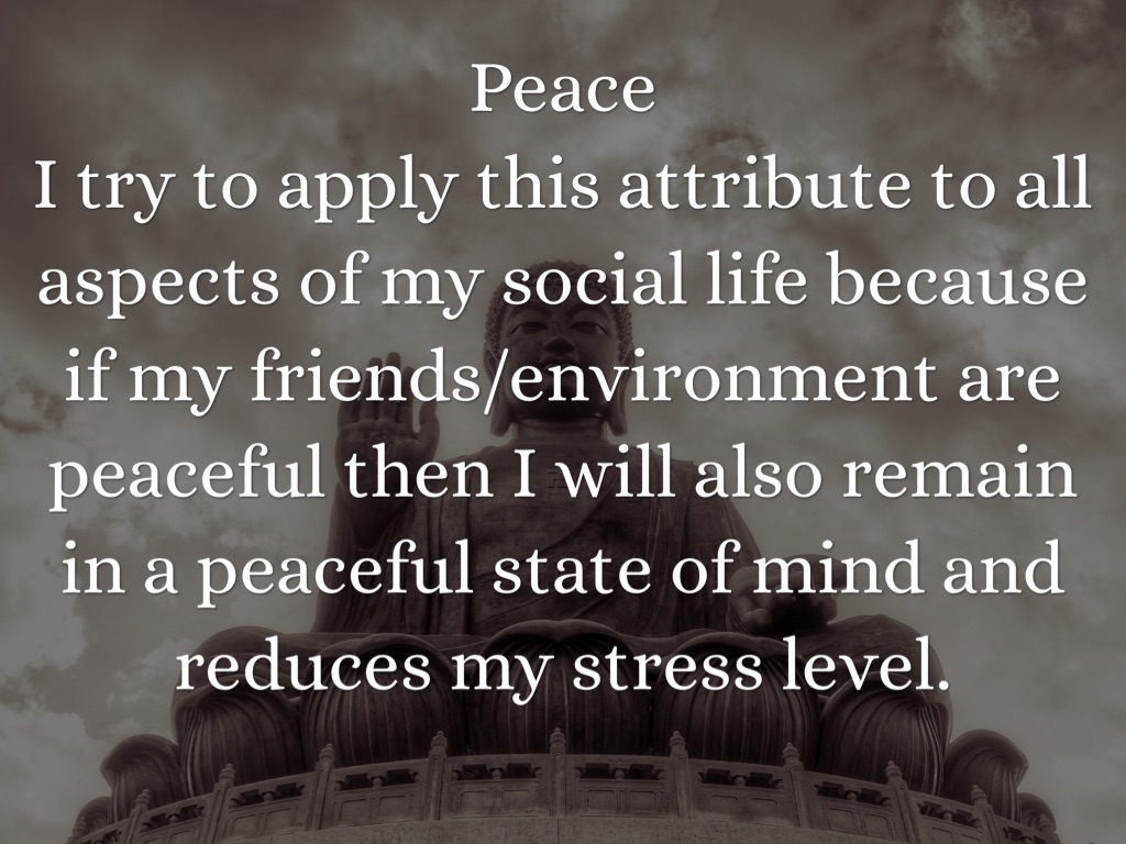 Peace I try to apply this attribute to all aspects of my social life because if my friends/environment are peaceful then I will also remain in a peaceful state of mind and reduces my stress level.