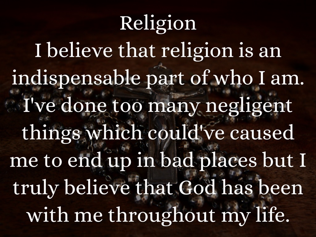 Religion I believe that religion is an indispensable part of who I am. I've done too many negligent things which could've caused me to end up in bad places but I truly believe that God has been with me throughout my life.