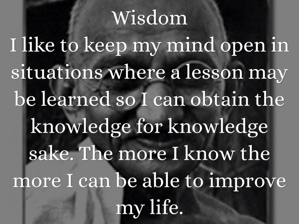 Wisdom I like to keep my mind open in situations where a lesson may be learned so I can obtain the knowledge for knowledge sake. The more I know the more I can be able to improve my life.