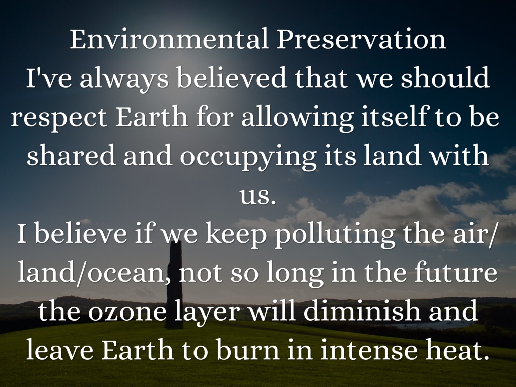 Environmental Preservation I've always believed that we should respect Earth for allowing itself to be shared and occupying its land with us. I believe if we keep polluting the air/land/ocean, not so long in the future the ozone layer will diminish and leave Earth to burn in intense heat.