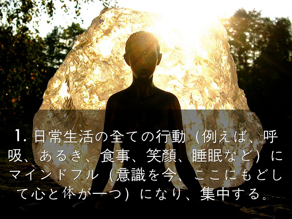 1. 日常生活の全ての行動(例えば、呼吸、あるき、食事、笑顔、睡眠など)にマインドフル(意識を今、ここにもどして心と体が一つ)になり、集中する。