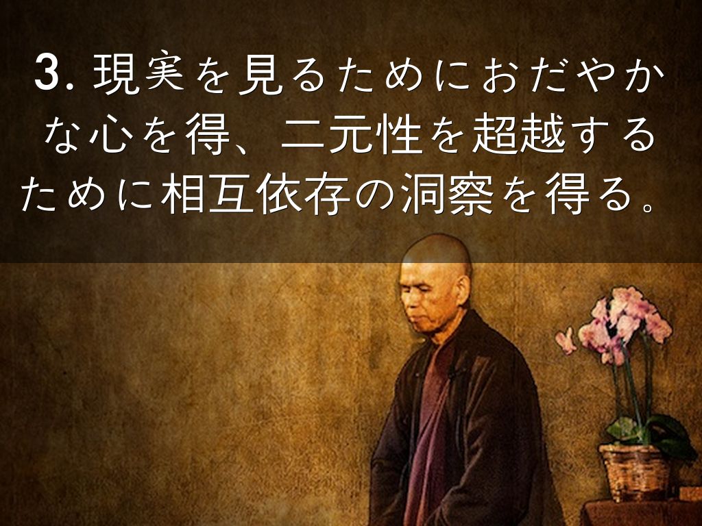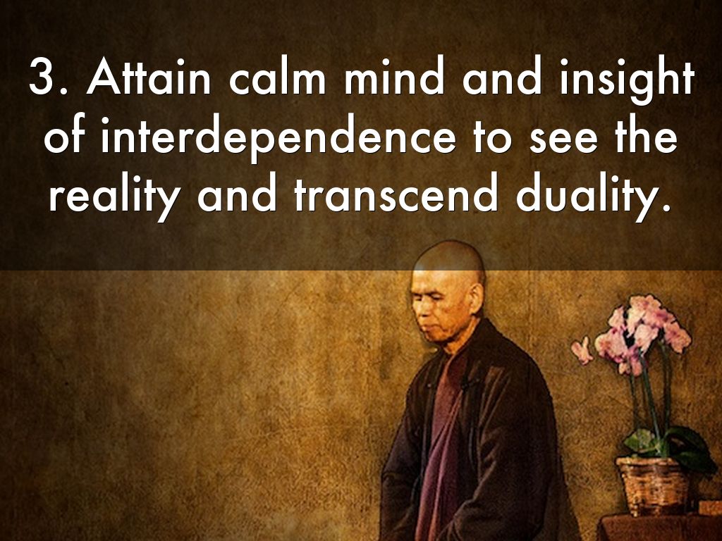 3. Attain calm mind and insight of interdependence to see the reality and transcend duality.