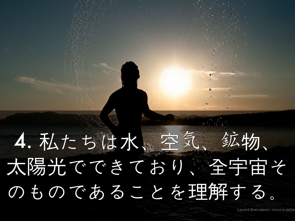 4. 私たちは水、空気、鉱物、太陽光でできており、全宇宙そのものであることを理解する。
