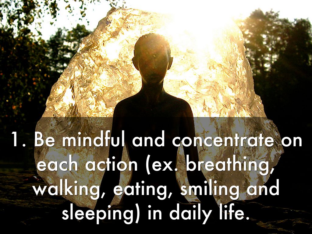1. Be mindful and concentrate on each action (ex. breathing, walking, eating, smiling and sleeping) in daily life.