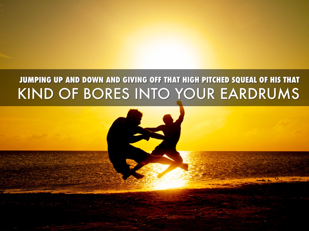 JUMPING UP AND DOWN AND GIVING OFF THAT HIGH PITCHED SQUEAL OF HIS THAT