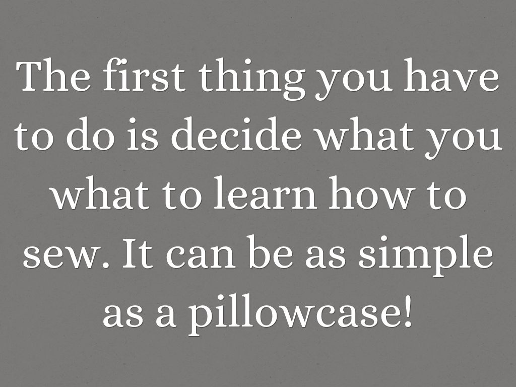 The first thing you have to do is decide what you what to learn how to sew. It can be as simple as a pillowcase!