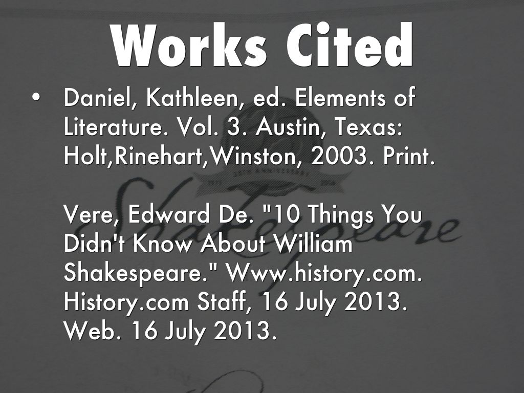 Daniel, Kathleen, ed. Elements of Literature. Vol. 3. Austin, Texas: Holt,Rinehart,Winston, 2003. Print. Vere, Edward De. "10 Things You Didn't Know About William Shakespeare."