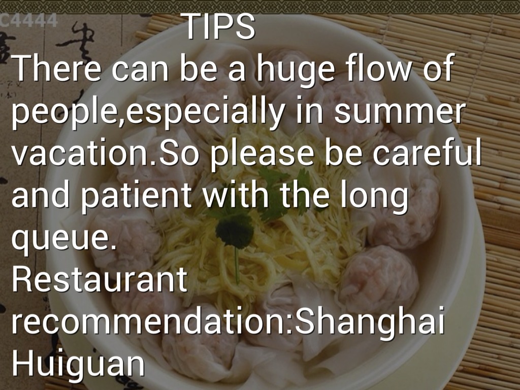 TIPS There can be a huge flow of people,especially in summer vacation.So please be careful and patient with the long queue. Restaurant recommendation:Shanghai Huiguan